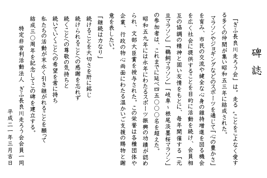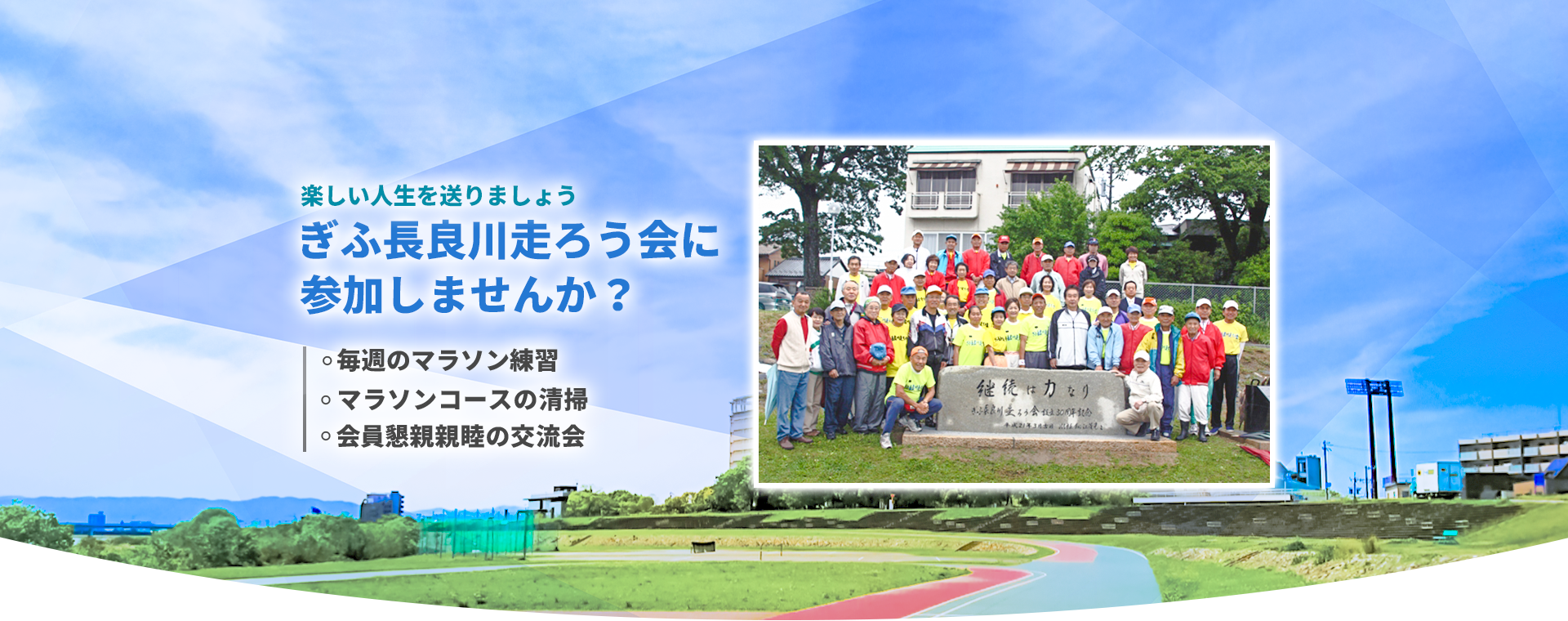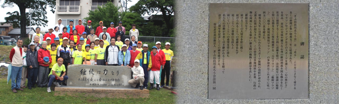 昭和53年に結成された「ぎふ長良川走ろう会」はマラソンを通じて「心の豊かさ」を育み、市民の交流や健全な心身の維持増進を図る機会を広く社会に提供することを目的に、会員相互の協調の精神と固い友情をもとに活動を続けています。